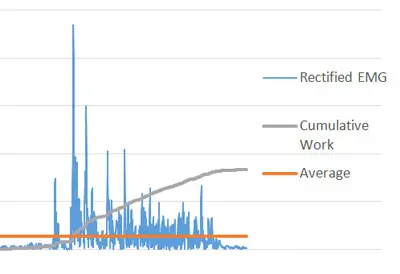 Other functions are also available, like calculating the average of the peaks, or the cumulative amount of work the muscle has done. (See below, orange for average and grey for cumulative work.)
